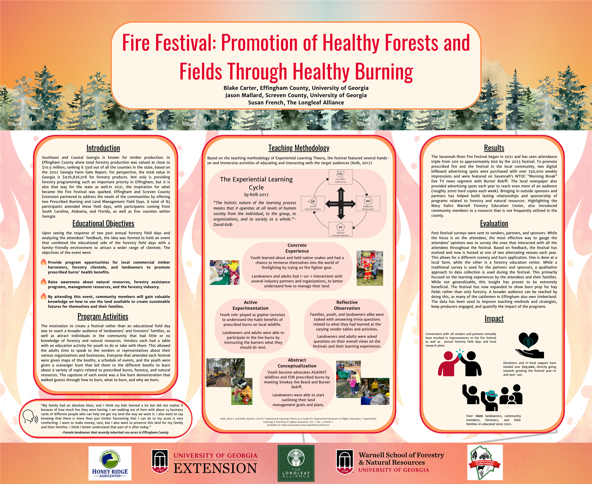 Effingham County Extension and the Longleaf Alliance have created an annual event that started as a simple prescribed burn field day, and since transformed into an annual prescribed burn event to teach landowners, new and existing, about the benefits of burning, the assistance programs available, as well as connect the public with natural resource organizations, and teach the youth in the community about forestry as a future career path. The results have been incredible, seeing an average of 500 attendees from Effingham and the surrounding counties the past four years. Kids have the opportunity to see forestry as a potential area that may interest them as they grow up and choose their career paths. Landowners and adults have opportunities to meet with NRCS representatives, foresters, and specialists to learn more about natural resource conservation and the opportunities that planting pines can have for them long term. Since 2021, there have been four Fire Festivals that have taken place. The first year saw 300 attendees and has since seen an over 200% increase in attendance in 2023 boasting 650 community members participating, while 2024 saw a bit of a decline, potentially due to weather, hosting only 450 community members. The attendees’ feedback has been extremely positive, with only suggested additions as constructive criticism. The attendees all have sited that the event is educational for the kids and adults. One quote said, “it gives the kids plenty to do and learn from, while at the same time allows dads and moms to ‘talk business’ with the different organizations that are in attendance.”