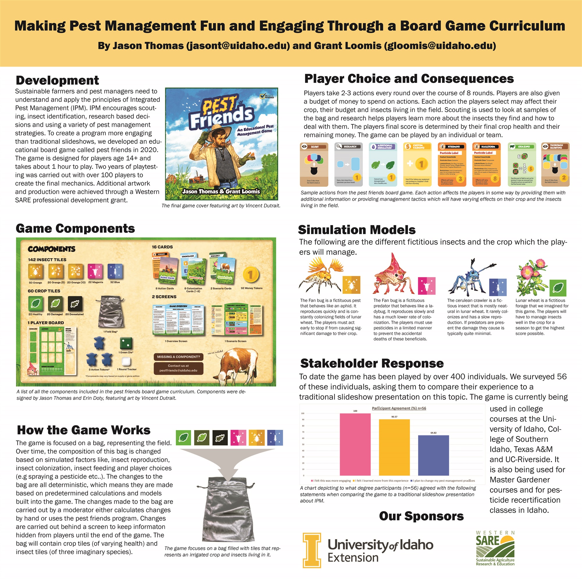 Sustainable farm managers need to have a thorough understanding of Integrated Pest Management (IPM) to deal with ongoing and emerging pests. Our team developed an educatonal board game known as pest friends, which allows players to make decisions and experience the consequences of said decisions. The game is a simulation of a fictitious crop known as lunar wheat. In the simulation, players encounter new and unknown bugs, research them and then make decisions based on scouting data and research. After the players go through a growing season they are able to see the consequences of their decisions and how insect populations fluctuated over the season. This poster will showcase how the game works in a simplified manner to help county agricultural agents learn about this new tool which was recently created.